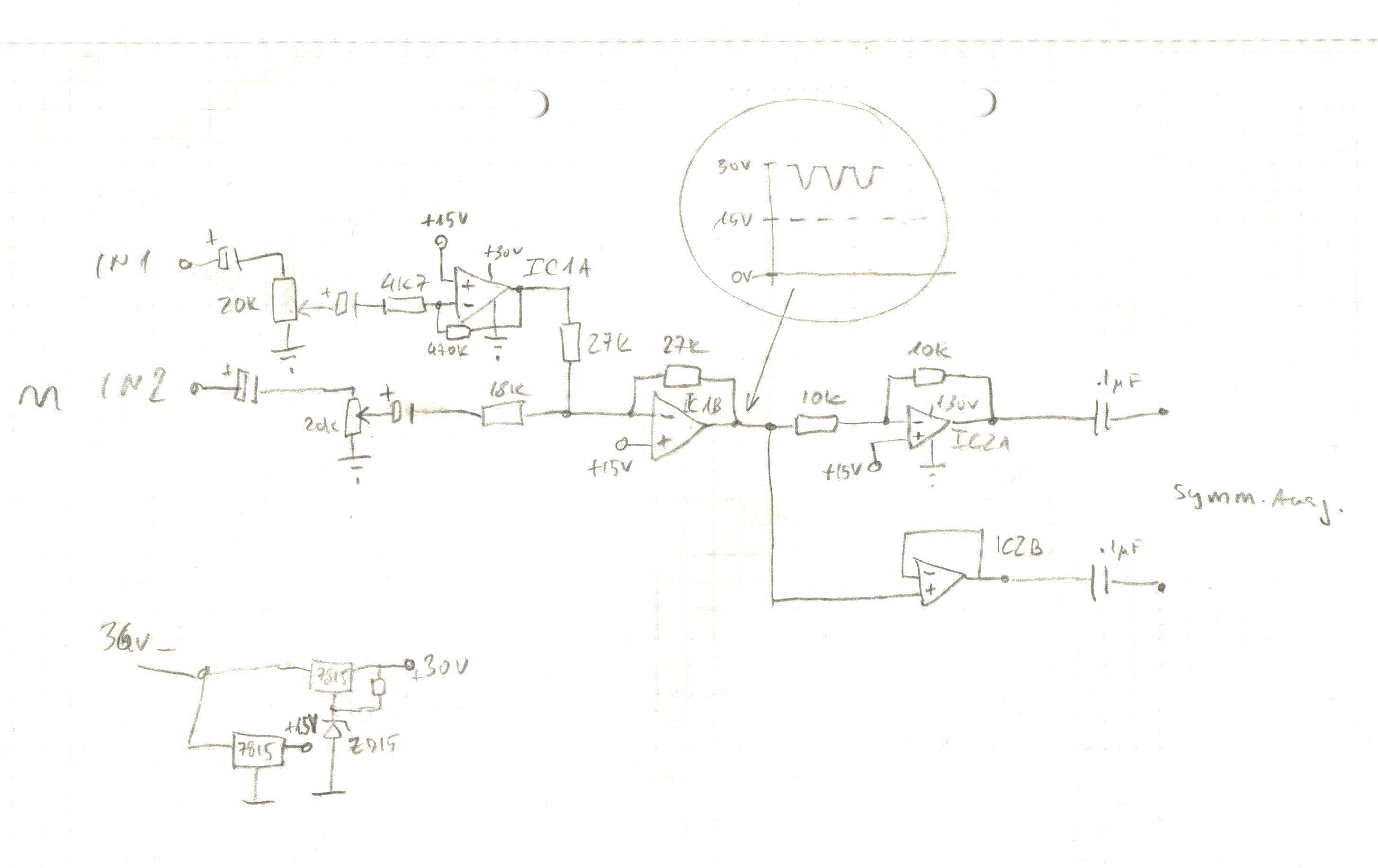 Auf alle Fälle sind die Elkos nach den Poties verpolt - dadurch werden die leitend, und bewirken einen Gleichstrom in den Summationspunkt der nachfolgenden OPV's, was dessen Arbeitspunkt (am Ausgang) nach oben richtung +30V drückt.