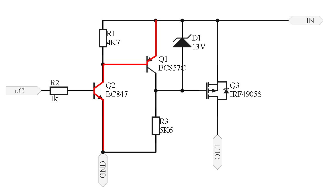 ich fang noch mal einen neues Thread auf, da die Threadüberschrift nicht mehr so richtig past. ( FET mit 10A dauer + verarmung(=öffner) ) hoffe es hat keiner ein problem damit. Möchte jetzt einen MOSFET als "Öffner" verwenden. --> wenn uC 0Volt ist soll Fet durchsteuern und wenn uC 5Volt sind nicht durchsteuern. hab jetzt eine schlatung gezeichnet und auch aufbaut. Als FET verwende ich den IRF4905S. Prinzipell funktioniert die schlatung, nur wenn ich den uC eingang auf 5Volt ziehe, wird einer der Tranistoren geschossen. Widerstaende hab ich eher geschätzt als gerechnet. (Sorry, aber bin in dem ganzen noch relativ neu) mfg empi