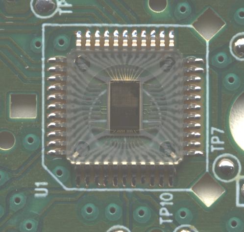 Nabend! Hab eben beim Basteln, eine alte optische Maus auseinander genommen. Darin bildet der µC und der optische Empfänger eine Einheit. Der Controller selbst war nicht in einem Kunstharzgehäuse wie man es normal kennt sondern transparent und darüber eine schwarze Plastikkappe. Ich dachte mir, ich schieß mal nen Foto davon und stell es hier mal rein. Da hier oft Leute auf der suche nach Lehrmaterial zum Thema µC sind. Im originalen kann man auch ganz hauchfein die Bonddrähte erkennen. Leider ist die Makro-Aufnahme meiner Kamera nicht so gut als das ich das ganze in XXL-Reso zur Verfügung stellen könnte. Aber immerhin, sein Zweck erfüllt es :) Grüße