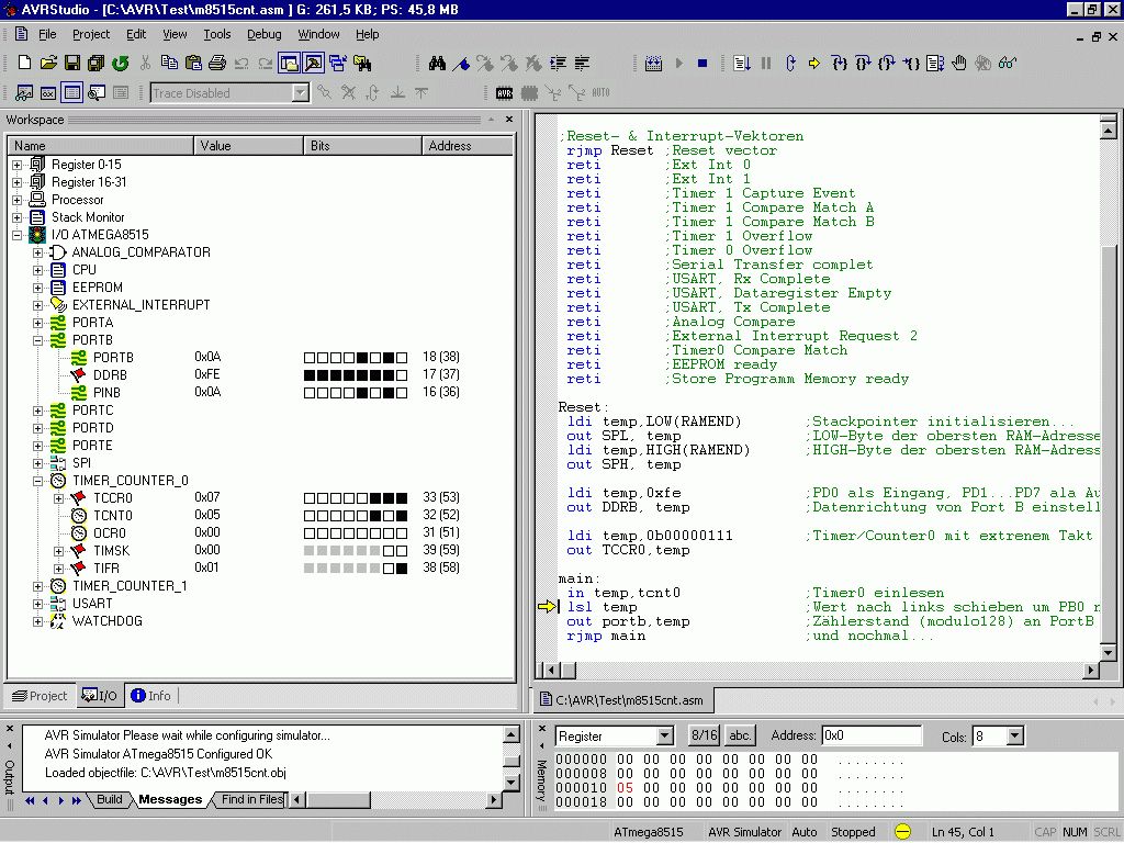 Hi... Ich habe dir mal ein ganz kleines Demo-Programm für Timer/Counter0 als Ereigniszähler geschrieben, mit AVR-Studio simuliert (sorry, der Button heißt nicht "Simulation" sondern "Debug") und getestet. Es funktioniert im Simulator. Im Anhang findest du einen Screenshot des AVR-Studios während der Simulation. Links oben (Workspace) ist der I/O-Bereich geöffnet, davon nur die Teile, die mich momentan interessieren, also PortD und Timer/Counter0. Mausklick auf das rechte Bit von PinB setzt bzw. löscht den Zähleingang. Bei jedem Setzen wird tcnt0 um 1 erhöht. Die restlichen Bits von PortB zeigen den Zählerstand (nur 7 Bit) an. Rechts oben siehst du das Programm und den Zeiger, welche Zeile gerade abgearbeitet wird. Mit F11 geht es einen Schritt weiter. Links unten (Output) stehen Meldungen des Systems, so auch Fehlermeldungen. Rechts unten lasse ich mir die Registerinhalte zeigen, soeben veränderte Werte werden rot dargestellt. Hier wird mom nur r16 benutzt. Und hier ist nun der Programmcode: ----- Schnipp ----- ;Der Timer0 (8Bit) wird als Zähler verwendet ;Der Zähleingang von Timer/Counter0 ist PB0. ;Der Zählerstand wird an den restlichen Pins des PortB angezeigt. ;Dazu ist kein Interrupt erforderlich. ;In Entwicklung .include "m8515def.inc" ;Registerdefinitionen .def temp = r16 ;Reset- & Interrupt-Vektoren rjmp Reset ;Reset vector reti ;Ext Int 0 reti ;Ext Int 1 reti ;Timer 1 Capture Event reti ;Timer 1 Compare Match A reti ;Timer 1 Compare Match B reti ;Timer 1 Overflow reti ;Timer 0 Overflow reti ;Serial Transfer complet reti ;USART, Rx Complete reti ;USART, Dataregister Empty reti ;USART, Tx Complete reti ;Analog Compare reti ;External Interrupt Request 2 reti ;Timer0 Compare Match reti ;EEPROM ready reti ;Store Programm Memory ready Reset: ldi temp,LOW(RAMEND) ;Stackpointer initialisieren... out SPL, temp ;LOW-Byte der obersten RAM-Adresse ldi temp,HIGH(RAMEND) ;HIGH-Byte der obersten RAM-Adresse out SPH, temp ldi temp,0xfe ;PD0 als Eingang, PD1...PD7 ala Ausgang out DDRB, temp ;Datenrichtung von Port B einstellen, ldi temp,0b00000111 ;Timer/Counter0 mit extrenem Takt an PB0 (T0) triggern out TCCR0,temp main: in temp,tcnt0 ;Timer0 einlesen lsl temp ;Wert nach links schieben um PB0 nicht zu benutzen out portb,temp ;Zählerstand (modulo128) an PortB ausgeben rjmp main ;und nochmal... ----- Schnapp ----- Leider wird er durch die schmale Darstellung (Zeilenumbruch, Tabulatoren) hier etwas verstümmelt, im Anhang ist aber schon das Bild, deshalb hier im Text. Nach dem Kopieren in AVR-Studio dürfte der Programmcode wieder korrekt angezeigt werden. Viel Erfolg... ...HanneS...