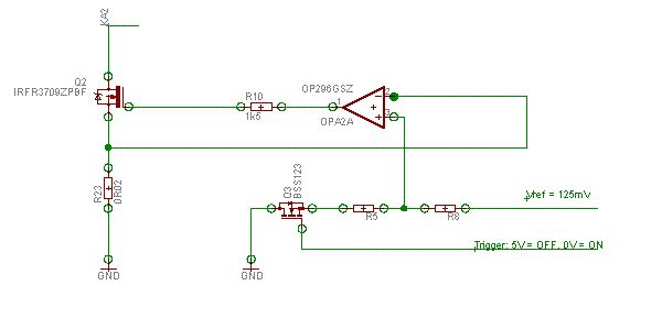 Super, vielen Dank. Wie funktioniert das mit der Triggerung der Referenzspannung? Kann ich mit einem IC wie dem LM4041 die Referenzspannung von 0.125V für den eingeschalteten Zustand erzeugen und diese Spannung anschließend durch einen Spannungsteiler für den ausgeschalteten Zustand schicken? Das andere Ende des Spannungsteilersn lege ich über einen weiteren Mosfet auf Gnd. Wenn am Gate des Mosfets eine Spannung anliegt, dann ist Vref_OPA = Ausgeschalteter Zustand, ansonsten ist Vref_OPA= Vref_ON. Vref_ON---- R1 ---- R2 ---- Mosfet ----Gnd | Vref_OPA Würde das so funktionieren, oder gibt es bessere Möglichkeiten die von Dir vorgeschlagene spannungsgesteuerte Stromquelle zu triggern. Gruß Christian