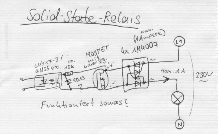 Hallo! Ja, also ich möchte rein aus Neugierde mal ein Solid-State-Relais in Einzelteilen nachbauen - und keins kaufen. Ich weiß, dass die Schaltung im Bild nicht lange funktionieren würde, weil an den Wechselstrom-Anschlüssen des Brückengleichrichters mindestens 13V abfallen müssen. Oder? Wie kann man das anders machen, damit die Ansteuerung über den Optokoppler galvanisch getrennt ist? Im Internet finde ich nur tonnenweise Werbung für die SSDs, aber keine richtige Schaltung vom "Innenleben". Herzlichen dank schonmal! :-) Stefan