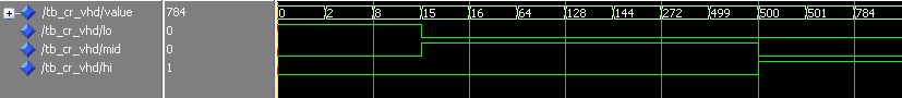 Also erst mal danke für die Hilfe! Der Code macht das in der Realität, Testbench ist was was ich bisher nicht hinbekomme :-) >Oder so: > > process (wert) begin > lo <= '0'; > mid <= '0'; > hi <= '0'; > if (wert<500) then > if (wert<15) then lo <= '1'; > else mid <= '1'; > end if; > else > hi <= '1'; > end if; > end process; Ja das habe ich auch schon versucht gleiches Ergebnis... Der Zähler ist ein Signal. Hier mein Code:
