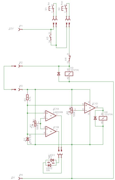 Hey, ich hab die angehängte Schaltung aufgebaut, und beide Schaltungsteile (oben: An- und Ausschalten, unten: Anzeige der Spannung und Abschaltung bei Unterspannung) funktionieren für sich einwandfrei. Sobald ich aber P2 mit P3 verbinde, zieht das Relais K4 nicht mehr an, es scheint zu schwingen! Erst hab ich gedacht, es liegt an ner unsauberen Gleichsspannung, aber auch an einer Autobatterie funktioniert es nicht. Zum Prinzip: Einschalten über einen Taster S1, Ausschalten über S2, über 11,5V leuchtet die LED grün, unter 11,5V umschalten auf rot (IC1A und IC1B), und bei unter 11V soll das Relais K4 die komplette Schaltung abschalten. An was könnte es liegen?