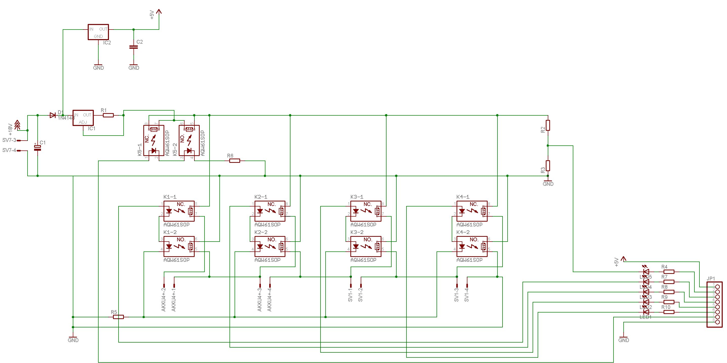 Karl heinz Buchegger schrieb: > Edit3: Was ist ein AQW61SOP? > Mit google finde ich kein Datenblatt dazu Schaut, dem Schaltsymbol nach zu urteilen, nach einem Wechselspannungs-SSR aus... Wie sind die Akkus verschaltet? 4x12V in Reihe? Der grobe Plan ist dann, das Ladegerät mittels der SSDs an einen der vier Akkus virtuell "anzuklemmen"? Eure Ladespannug muss dann aber von der µC-Versorgung galvanisch getrennt sein, sonst knallt das beim Umschalten. Ein Softwarefehler führt bei eurer Schaltung gleich immer zu Rauch und toten SSRs? Da macht Debuggen spaß ;) Thomas schrieb: wir wissen nur nicht, wie wir das programm machen sollen, dass der uC die Spannung bei jedem Akku nach der Reihe abfragt... Zeigt mal den Teil, wie die einzelnen Akkus verschaltet sind, und wie ihr dann die Einzelspannungen an die ADC-Pins des µC verschaltet hat... Ist der Teil schonmal getestet/angeschlossen worden?