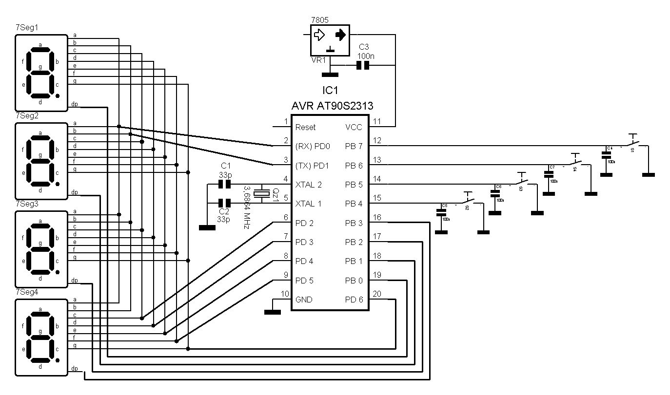 na passt doch, die schlatung ist doch schon für multiplexbetrieb ausgelegt. alle datenpins hängen parallel, über pb0 - 3 steuerste die einzelnen anzeigen. wenn das dein orig ist, fehlen da nicht noch die vorwiderstände? 5v direkt auf ein led-segment ist dessen zackiger tod, es sei denn du stellst per software sicher, dass keiner 'dauerfeuer' bekommt. oder sind diese dinger für so einen direktbetrieb ausgelegt, und wenn ja, was sagt dein avr dazu, wenn 4x betriebsstrom fliessen muss, könnten doch leicht mal 'n paar mamps zusammen kommen. fröhliches toben noch, harry