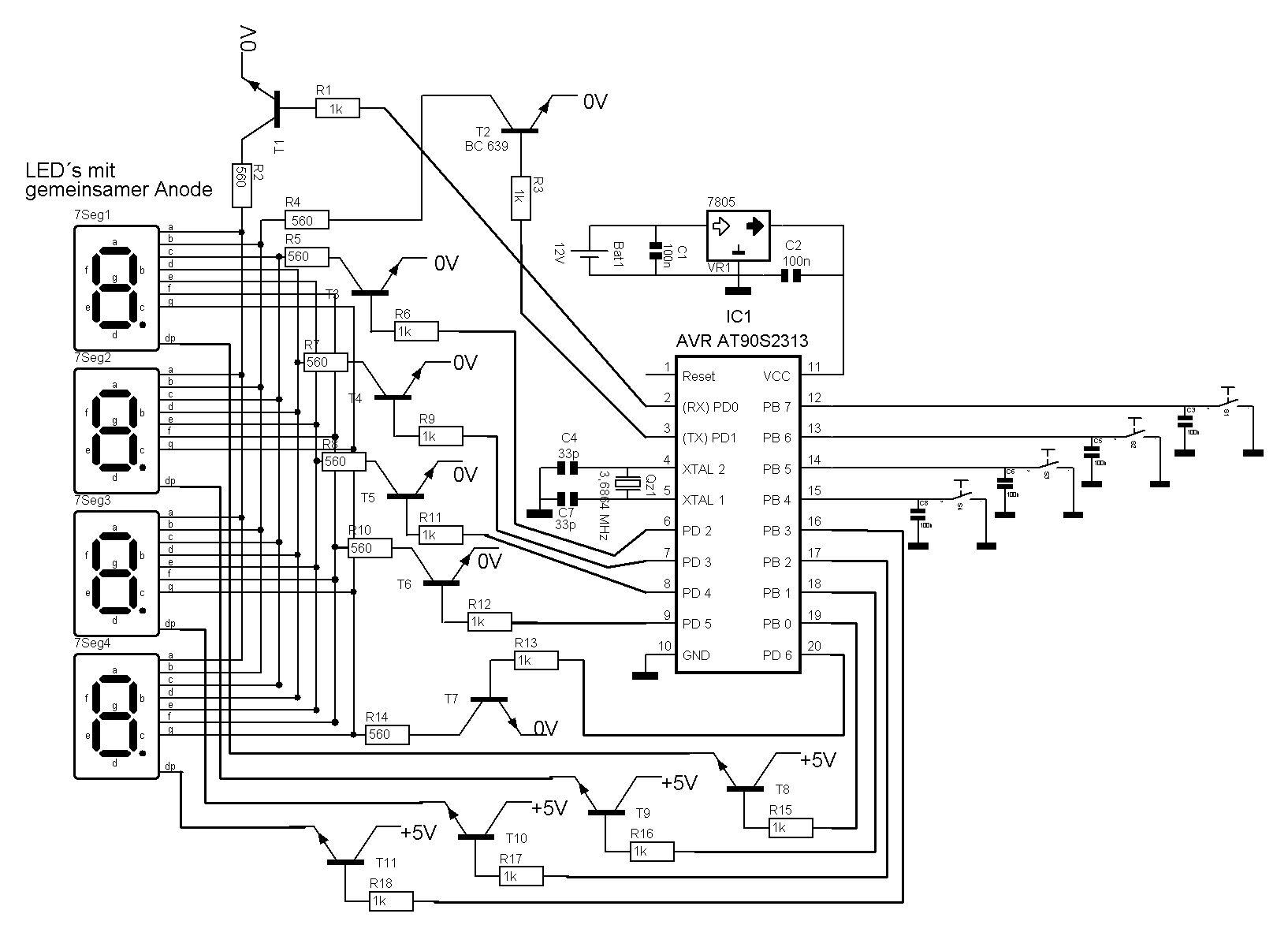 So, also ier ist nun die Schaltung mit allen Vorwiderständen und Transistoren - sollte funktionieren ;-) ------------------------------------------------------- ANZEIGE: cls: lcd "Anzahl Türöffnungen: "+str(TUER_1_ZAEHLER) ' schon haste die Anzahl auf'm display, ist um klassen einfacher als ' 7-segment anzeigen multiplexen RETURN ' wichtig, sonst läuft dein proc ins nirwana und wo geht das Programm weiter wenn ichbei Return angekommen bin? geht´s dann da weiter wo der Befehl zur Sprungmarke ANZEIGE: steht? Portb = &B0000 'PB 0-3 auf Low setzen? -> funktioniert das um die aktive anzeige zu deaktivieren damit beim nächsten durchlauf die nächste Anzeige an geht? ach ja, und wo soll ich das hinschreiben? Tobias