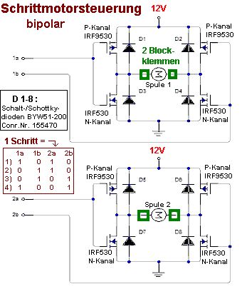 Hi, hab ich das endlich richtig kapiert? Ich will einen Schrittmotortreiber diskret aufbauen, so wie in der Zeichnung, also 2 H-Brücken. Steuerung mit COM vom PC oder mit einem PIC und 4 Transistoren für die 12V. 1)Passt das so? 2)Stromversorgung: PC-Netzteil (250W), also 5V und 12V. Mit 12V sollte die Sache laufen. Kann ich, damit der Motor beim stillstehen nicht so heiss wird (aber trotzdem nicht alle Kraft verliert), a) einfach über ein Umschaltrelais auf 5V gehen? Zu einfach? Oder soll ich b) mit einer PWM (NE555) und einem Mosfet die 12V-Versorgung um 50% runterschrauben? 3) Kann man, wenn man nur eine H-Brücke nimmt, einen Getriebemotor 12V/5A reinhängen und der dreht sich, wenn 1a high und 1b low ist links, wenn 1a low und 1b high ist, rechts (oder halt umgekehrt)? lg Triti
