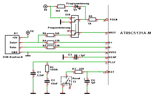 Hallo Stefan, die angehängte Schaltung funktioniert zumindest... Nachdem der Pull-Up an D+ geschaltet wurde muß man recht schnell resetten, dass Win den Controller findet. Er taucht dann im Gerätemanager unter dem Punkt JUNGO auf. Bei mit darf in FLIP der Haken für BLJB nicht gesetzt sein (im Unterschied zum AT89C51RC2, den ich auch verwende). Kann sein, dass der 5131 auch noch einen Bootloader für seriell engebrannt hat. unn tschuess Bernhard