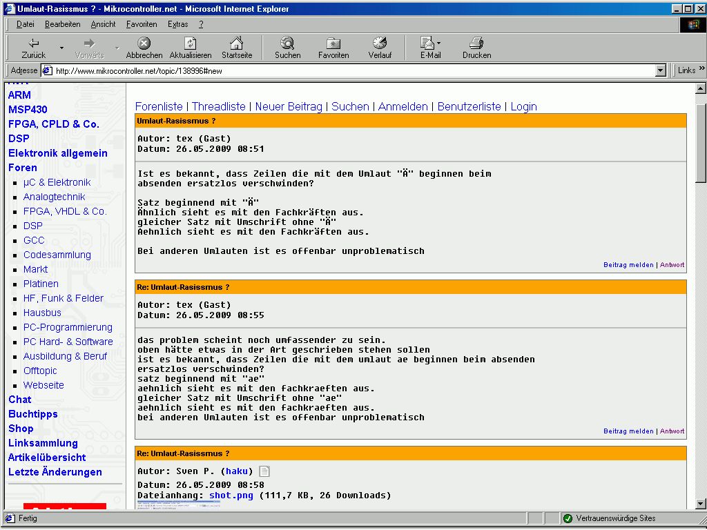 das problem scheint noch umfassender zu sein. oben hätte etwas in der Art geschrieben stehen sollen ist es bekannt, dass Zeilen die mit dem umlaut ae beginnen beim absenden ersatzlos verschwinden? satz beginnend mit "ae" aehnlich sieht es mit den fachkraeften aus. gleicher Satz mit Umschrift ohne "ae" aehnlich sieht es mit den fachkraeften aus. bei anderen Umlauten ist es offenbar unproblematisch