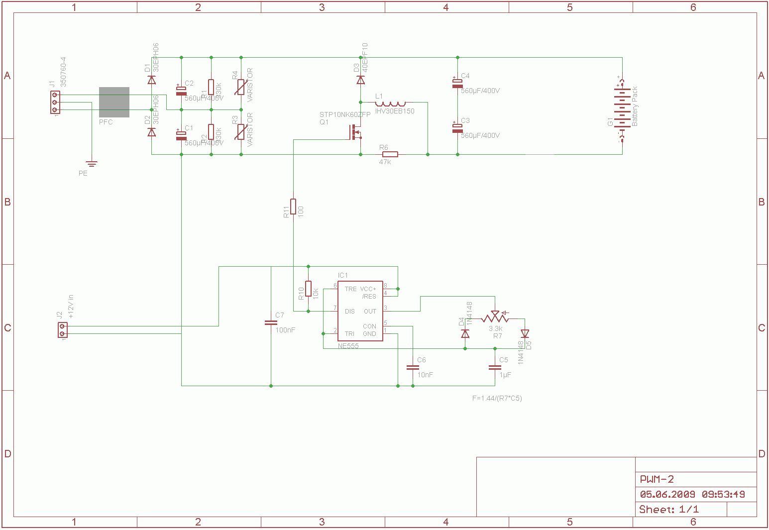 Ich finde Dein Projekt sehr gut, ich habe selbst ein MiniEl. Experimentierfreudige Leute wie Dich braucht das Land. Denke aber immer auch an die Sicherheit (Sicherungen, NotAus ...). Nun gut, ob das 3kW-Netzteil so klein wird wie ein PC-Netzteil? Möchte ich mal bezweifeln (zumindest bei galvanischer Trennung). Zu Schaltplan: Die Gate-Ansteuerung geht so nicht, da DIScharge ein OC-Ausgang ist. Der PullUp von 10kOhm bringt viel zu wenig Strom, um das Gate schnell genug zu laden. Nimm OUT über 10 Ohm, der hat push-pull. Und eine Schutzschaltung für Unterbrechung der Last würde ich auch noch spendieren, sonst wächst die Spannung ins Unendliche. Bei Deiner Leistung ist eine PFC fast schon Pflicht. Schau Dir mal die ICs an, die sind im Prinzip dafür gebaut, eine Geichspannung von ca. 350-450 V zu erzeugen, mit ein paar Änderungen lassen die sich sicher auch zu höheren Spannugen überreden. Zu Not folgender Vorschlag, um ein wenig Strom in die Akkus zu bringen: 2 12V-Halogentrafos als Potentialtrenner (230-->12-->230) und die entstehenden 230V in Reihe zum Netz, dann gleichrichten gibt theor. 650V. Ich habe noch eine Projektbeschreibung eines Wechselrichters für Brennstoffzellen, da kann man schön lesen, mit welchen Problemen die bei dieser Leistung zu kämpfen hatten. Suche ich Dir mal heraus. Außerdem gibt es bei eb.. öfters mal passende Netzteile von Heinzinger, HP oder Konsorten: http://cgi.ebay.de/Heinzinger-Hochspannungsnetzgeraet-PHN-1200-4_W0QQitemZ150346813855QQcmdZViewItem 1200V 4A ist halt ein 19"-Schrank.