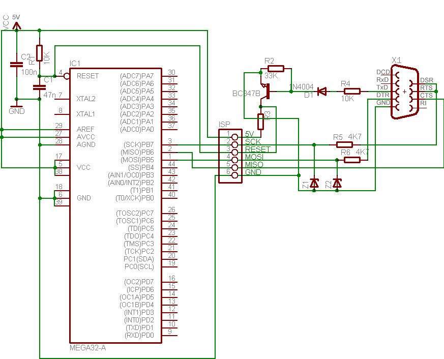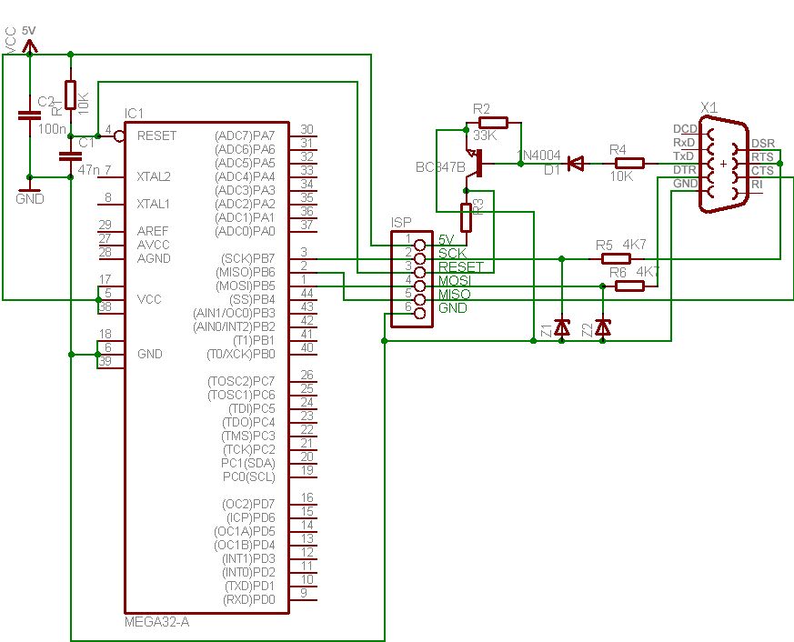 Hallo Leute, Die Schaltung im Anhang sollte mir ermöglichen einen ATMEGA32 mittels Ponyprog zu programmieren. Der linke Teil der Schaltung basiert auf der Selbstbauschaltung auf mikrocontroller.net( [[http://img189.imageshack.us/img189/7941/avrschaltplan1.gif]] ). Der rechte Teil der Schaltung soll der ISP mittels RS232 sein. Ich hab ihn von dieser Seite: [[http://www.olimex.com/dev/images/avr-pg1b-sch.gif]] (artikellink: [[http://www.olimex.com/dev/]] ). Programmieren tu ich(ich versuch's zumindest) mit Ponyprog. Leider kommt immer die Fehlermeldung "Unknown Device(-24)". Wenn ich auf "Probe" klicke, dann steht da "Test OK". Nun Frage: 1) Liegt es vielleicht daran, dass ich keinen Max232 einsetzte?(5V Netzgerätspannung allein reicht nicht?) 2) oder ist die Schaltung sowieso völliger unfug? mfg