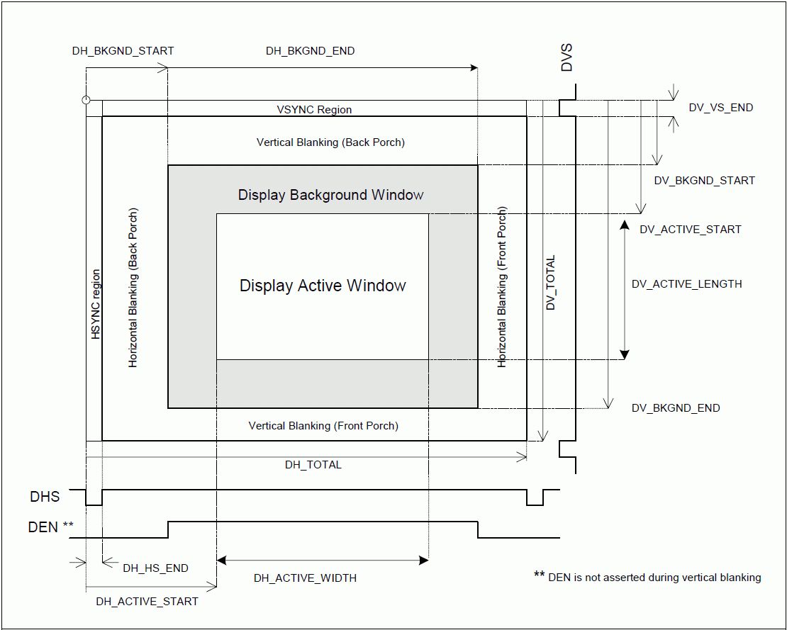 ...hier mal ein Auszug aus einem Scaler-Datenblatt. Ist etwas kompliziert zu lesen (horizontal und vertikale Zeitachsen), aber wenn man's begriffen hat ist's ganz anschaulich. (Anmerkung zum Bildchen: Im Normalfall ist "verschenkt" man keine Pixel an ein "Display Background Window", das dient hier nur der Beschreibung einiger Register des Bausteins aus dessen Datenblatt ich das Bildchen habe)