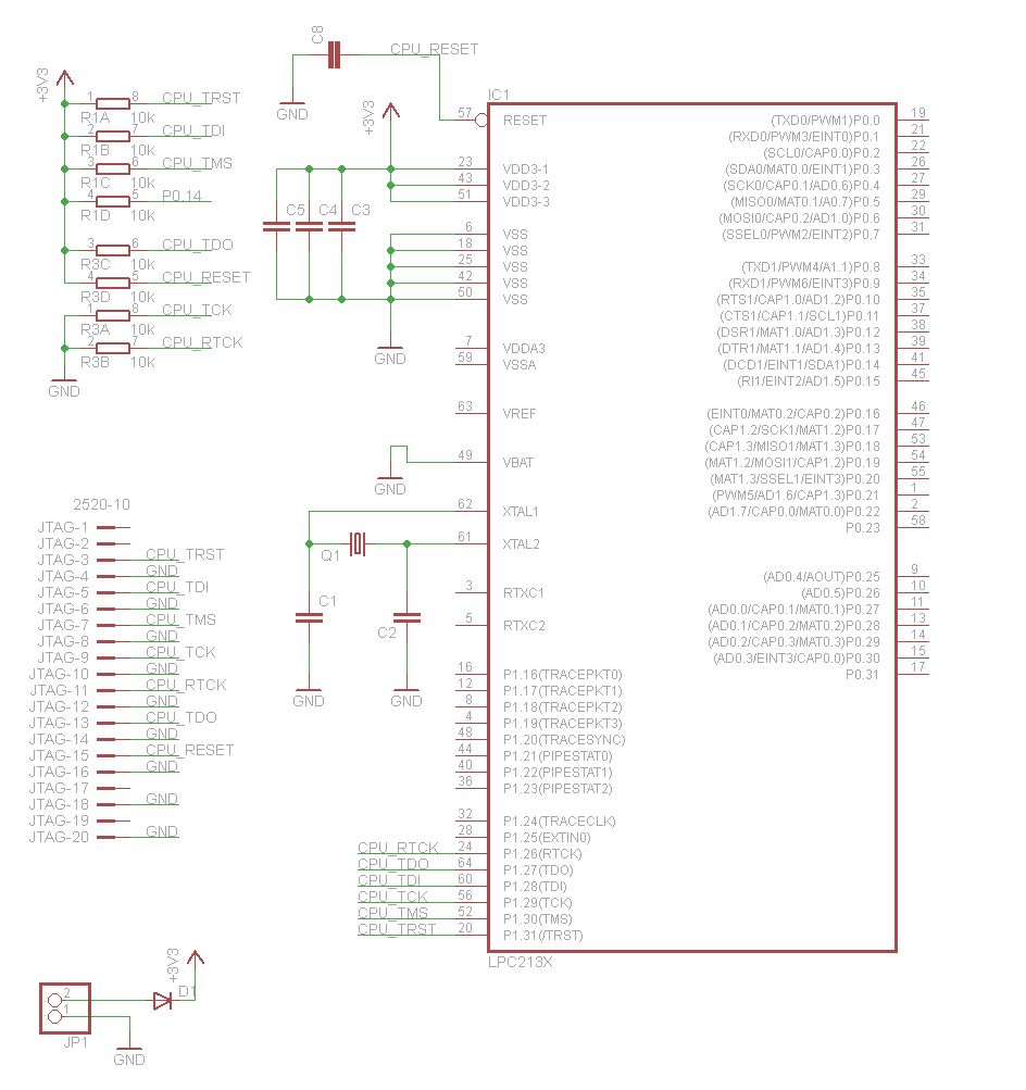 Hallo zusammen, ich habe das Problem, dass der Mikrocontroller LPC2138 zu viel Strom im Power-down Modus verbraucht. Die Application Notes AN10421 und AN10404 sind mir bekannt und habe ich auch beachtet. Der Stromverbrauch beläuft sich auf ca. 500 µA. 100 µA verursachen die beiden Pull-downs an P1.26 und P1.29. Den Rest kann ich mir jedoch nicht erklären. Der Code ist recht unspektakulär. Es wird zum Messen des Stromverbrauchs lediglich in den Power-Down Modus gewechselt. Schaltplan ist angehängt. Vielleicht fällt euch noch etwas dazu ein. Gruß Daniel