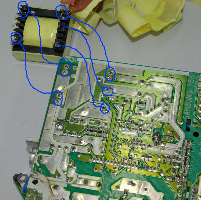 Hallo zusammen! Ich habe hier ein Netzteil aus einem Mac G4. Es handelt sich genauer um ein Samsung PSCF401601B. Beim Einschalten fliegt/flog die Haussicherung heraus. Ich meine nun einen defekten MOSFET (STW20NM50FD) identifiziert zu haben. Um diesen auszuloeten musste ich eine (Speicher-?)Drossel entfernen. Nun bin ich etwas verwirrt, da die Drossel an 4 verschiedenen Leiterbahnen angeloetet ist aber ich nur 2 angeschlossene Pins an der Drossel sehe, d.h. eine Wicklung. Die anderen Pins scheinen alle unbelegt. Macht das irgendwie Sinn?! Was koennte denn den MOSFET zum durchbrennen bewogen haben? Die Kondensatoren sehen alle ok aus und ich kann keine durchgebrannten Leiterbahnen entdecken. Gruss, --stefan