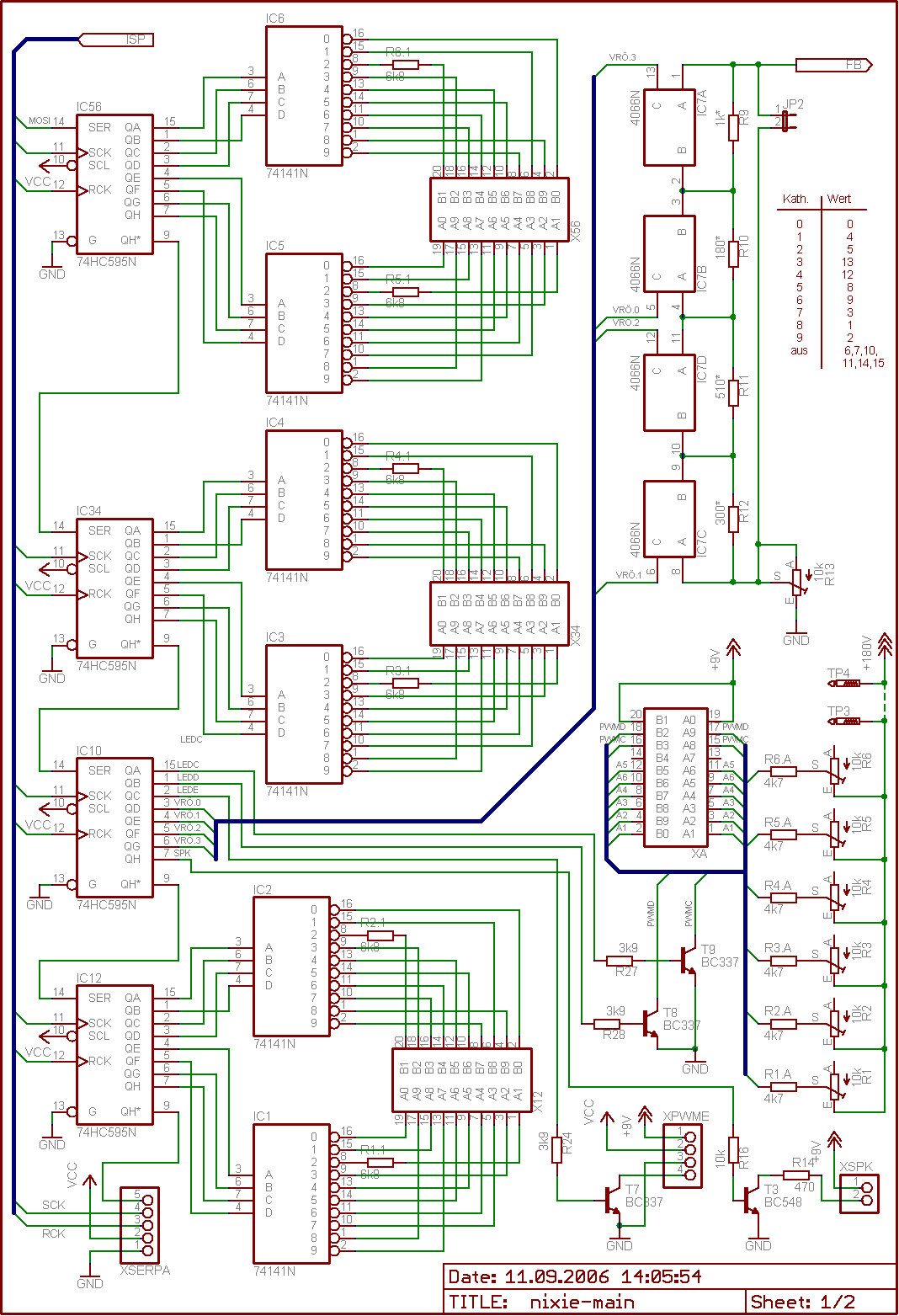 Legst du zum Ausschalten die Eingänge der Treiber auf 0? Ich mach das so, daß ich am Eingang nen Code > 9 anlege (74141 + ZM1210). Die Tabelle mit den BCD-Werten ist oben rechts, die Röhren sitzen an X12, X34, X56 (Kathoden) und XA (Anoden). Johann