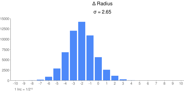 ...und für den Winkel Die Fehler sind wie zu erwarten gut Normalverteilt in einem Intervall von ca 16 Inkrementen. Das ist auch zu erwarten bei 16 Iterationschritten und Fehlerfortpflanzung. Aus der Reihe fällt der Sinus; der Fehler schein aus der Summe zweier Gauß-Glocken zu bestehen. Ich weiß aber nicht, wie die 2 Komponenten zustandekommen oder wie man die Kurve schmäler (d.h. die Standardabweichung kleiner) bekommt. Vielleicht findet ja jemand nen Rundungsfehler im Algorithmus, wobei erstaunt, daß das Phänomen nur den Sinus betrifft. Johann
