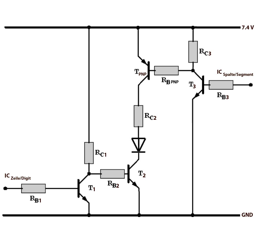 Hallo! Sorry dass ich nichts über meine Transistoren geschrieben habe. Ich verwende BC337(NPN) http://www2.produktinfo.conrad.com/datenblaetter/150000-174999/154598-da-01-en-BC337.pdf und BC327(PNP) http://www2.produktinfo.conrad.com/datenblaetter/150000-174999/154563-da-01-en-BC327.pdf von Motorola. Dass nur die Ausgänge O0 bis O7 sinken können ist mir klar. Bisher habe ich nur O0 oder O1 (IC Zeile/Digit) mit O11(IC Spalte/Segment) zum Testen verwendet. Mit Hilfe deiner Formel habe ich versucht mir die Widerstände richtig auszurechnen. Ich habe diesmal folgende Widerstände verwendet: RB3 = 51k Ohm RC3 = 7,7k Ohm RC2 = 150 Ohm RB2 = 40 Ohm RC1 = 500 Ohm RB1 = 1k Ohm RBpnp = 4.7k Ohm Entgegen meiner Berechnungen messe ich leider statt der geplanten 30mA nur 5mA an der LED. Welche Widerstände sind deiner Meinung nach für den Strom an der LED die Ausschlaggebenden? Meiner Meinung nach müssten die Widerstände RC3, RBpnp oder RB3 Schuld daran sein, denn wenn ich die Schaltung mit an der Seite ICSpalte überbrücke und direkt an 7,4V hänge erhalte ich die geplanten 30mA. Das Problem mit Multiplexing besteht leider noch immer. LG P.S: Danke für die viele Zeit die du dir nimmst, du bist mir eine grosse Hilfe