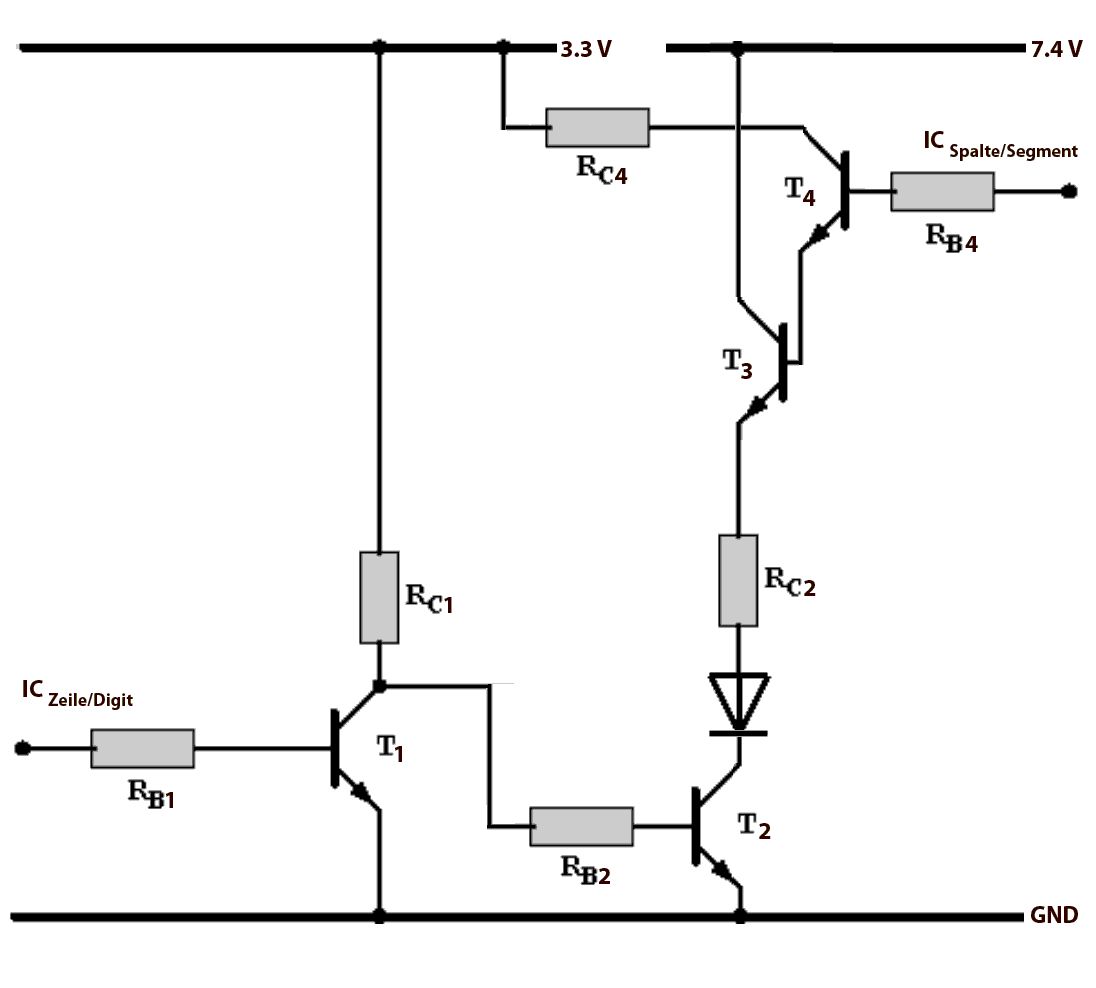 @Hubert: wie sollte in diesem Fall der PNP geschalten sein? Den NPN verstehe ich einigermaßen, aber mit dem PNP habe ich noch meine Probleme. - ich habe die Basis in Richtung Vorwiderstand der LED gehängt (RC2) - den Emitter an 7,4V - den Kollektor an den Widerstand zum IC Das dürfte aber falsch gewesen sein da die LED keine Reaktion gezeigt hat. Noch eine kurze Frage zum Verständnis: Warum sind es am Emitter des T3 weniger als 3,3V obwohl ich am Kollektor 7,4V anlege? @Falk: Der murks hat immerhin richtig geschalten :-) ist ja schon ein Fortschritt. Falls es in meinem ersten Post nicht richtig rübergekommen ist, ja ich möchte die LEDs als Matrix ansteuern. Der von dir vorgeschlagene Pegelwandler schaltet die Last am Kollektor des PNPs, nur muss meine Anode von einem zweiten Ausgang des ICs (IC Spalte/Segment) beschalten werden. Ich habe versucht die LED irgendwie zwischen Emitter des PNPs und den 7,4V zu schalten aber dies funktioniert nicht. Was ist eigentlich der Vorteil eines Pegelwandlers gegenüber meiner Schaltung im Bereich T1 und T2? Die Transistoren die an der Zeile des ICs hängen (bei mir T1&T2) müssen eigentlich nur die Verbindung der LED-Kathode zu GND bei LOW herstellen und bei HIGH unterbrechen. LG