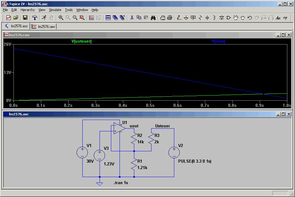 Razeputz schrieb: > Also wenn ich 0V am Ausgang habe, dann muss U_steuer = 3,3V sein. > Richtig? Ja. > Mit welchen Programm hast du die Schaltung simuliert? ich habe hier > pSpice Studentenversion, aber dort ist kein LM2576 enthalten. :-( Mit LTSpice: http://www.linear.com/designtools/software/#Spice Ich hatte auch keinen LM2576, aber zur Vereinfachung kann man ja auch mal einen normalen OP nehmen. Zumindest zur Kontrolle der Widerstände reicht das.