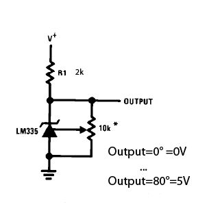 Hey, folgende Problemstellung: Aufgebaut werden soll eine Temperaturschaltung mit einem LM 335 Z Sensor. Am Ende steht eine Software die eine Anzeige von 0-80°C hat. Angeschlossen an eine Vellemann K8055 USB Interface Karte funktioniert die Simulation über das vorhandene Poti. 5V entsprechen 80°C, 0V = 0°C. Nun Möchte ich die Simulation durch das Poti durch eine Tempertaurschaltung ersetzen. Ich nutze dazu den Analogen Eingang der 0-5V zulässt. Dazu habe ich mir den Temeratursensor LM 335 Z gekauft. Meine Frage: Wie bekomme ich es Schaltungstechnisch hin, dass ich am Ende 0-5V habe bei annährend korrekter Temperatur? Datenblatt des LM 335 Z: http://pdf1.alldatasheet.com/datasheet-pdf/view/22761/STMICROELECTRONICS/LM335Z.html