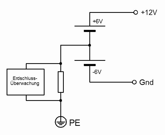 Wenn du wirklich beliebige Erdschlüsse überwachen musst, wird's wohl nur so funktionieren, dass du die 12 V intern als duale Spannungsversorgung mit 2 x 6V ausführst und den Mittelpunkt über einen (kleinen) Widerstand erdest, siehe Zeichnung. Nach aussen führst du halt nur die 12V und nennst die -6v dann "Gnd", die +6V werden zu VCC. Den Spannungsabfall am Widerstand kannst du dann überwachen, der tritt sowohl bei GND-PE als auch bei +12V-PE auf
