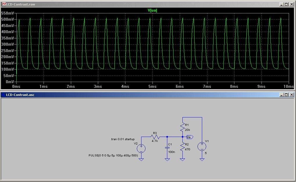 @Michael K. Wie ist denn deine Schaltung zu verstehen? In der Simulation zeigt sie keinen glatten Verlauf der Spannung (http://www.mikrocontroller.net/attachment/52937/LCD.gif).