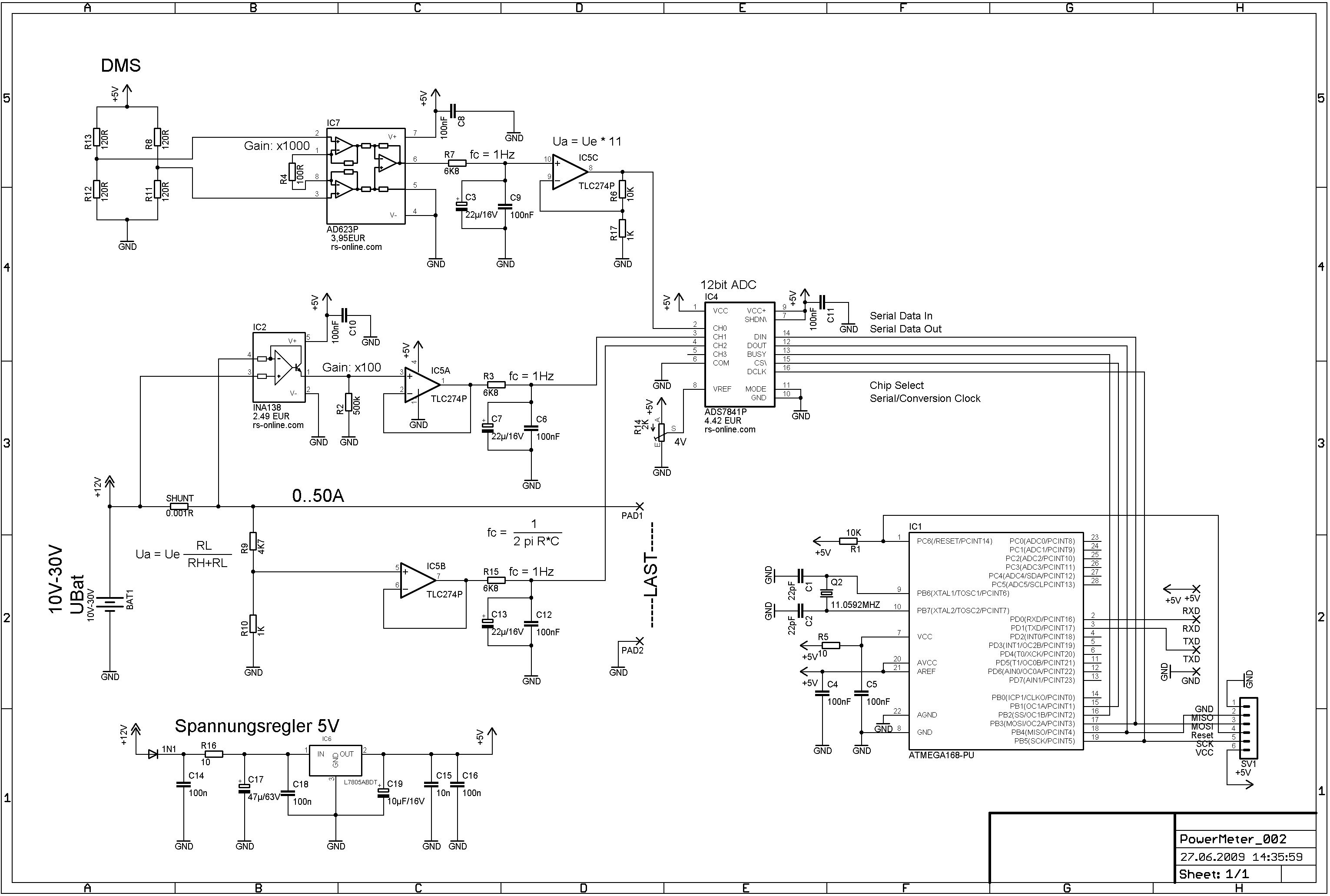 Ich habe die Schaltung geändert. Die Strommessung geschieht mit einem INA138. Als 12bit ADC habe ich den ADS7841 gewählt, weil er über 4 Eingänge und über eine serielle Schnittstelle verfügt. Alle Signale werden mit einem Tiefpass gefiltert, bevor sie digitalisert werden. Es gibt jetzt auch nur noch eine Spannungsquelle. Ich hoffe ich kann die Teile bei RS bestellen. Ist die Schaltung jetzt ok?