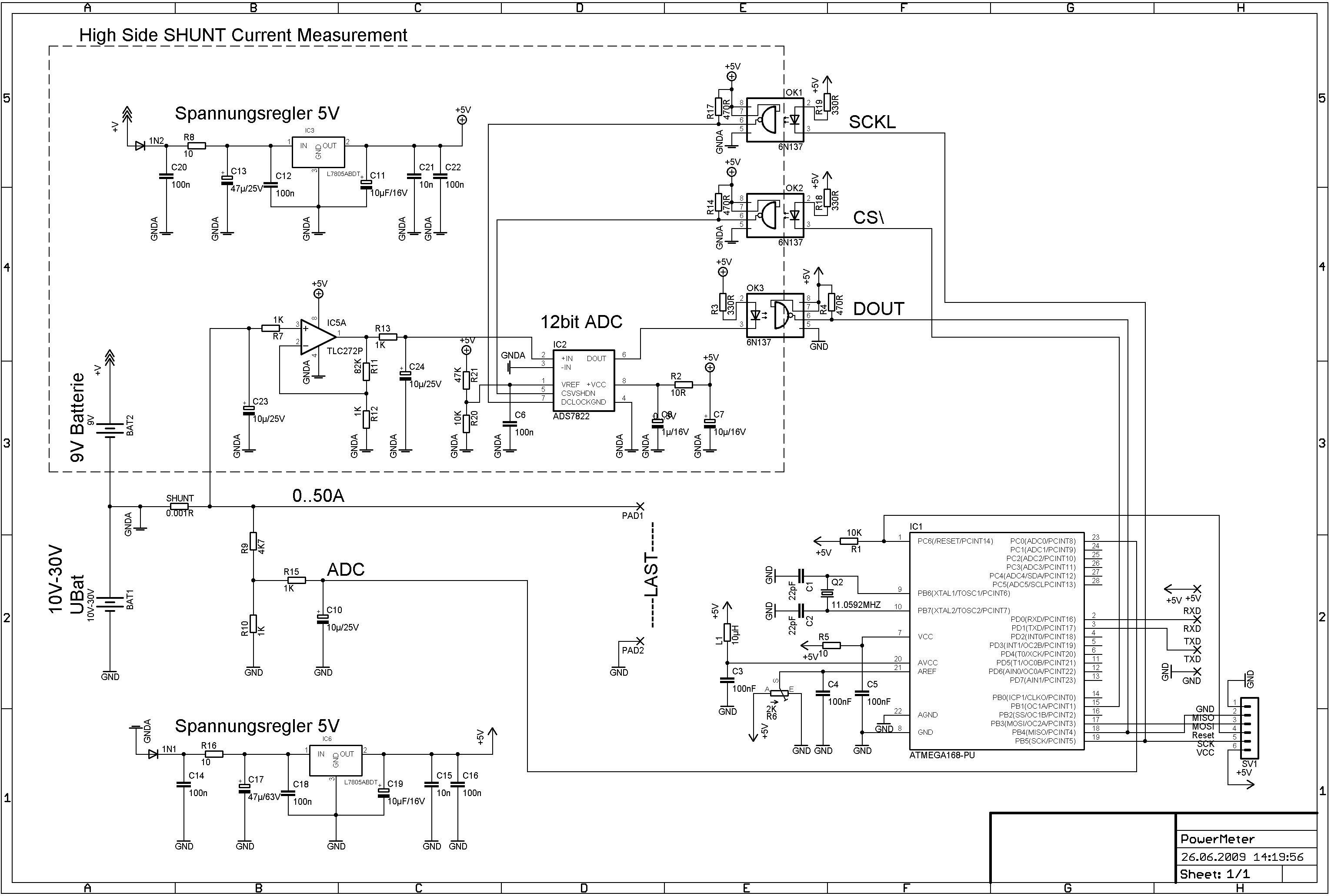 Hallo In diesem Beitrag hat Peter Dannegger einen Vorschlag zur Messung des Stromes über einen High Side Shunt gemacht. Beitrag "High-Side Strommessung AVR (Shunt)" "Du kannst nen ATtiny13 auf die 12V setzten und mit nem 79L05 versorgen. Und der sendet dann das Meßergebnis digital per Optokoppler an Deinen anderen AVR." Ich habe das Prinzip mit der 79L05 nicht ganz verstanden. Einfacher schien es mir eine weitere Spannungsquelle(z.B. 9V) in Reihe mit der Haupt-Versorgungspannung(z.B. 30V) zu setzten. Die "high side shunt"-Messung erfolgt über einen 12bit ADC(ADS7822), der über schnelle Optokopller(6N137) den digitalisierten Stromwert über SPI an den µC schickt. Die Spannung wird klassisch über einen Spannungsteiler mit dem 10bit ADC des AVR gemessen. Ich habe jetzt zwei Fragen: 1.) Wie funktioniert die Idee von Peter (wie kann ich die 9V Batterie einsparen) 2.) Ist die Schaltung ansonsten ok so? Danke Gruß Zoltan