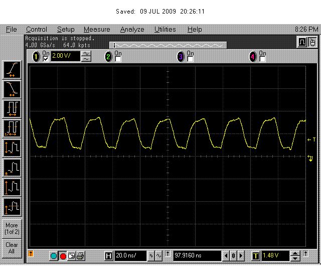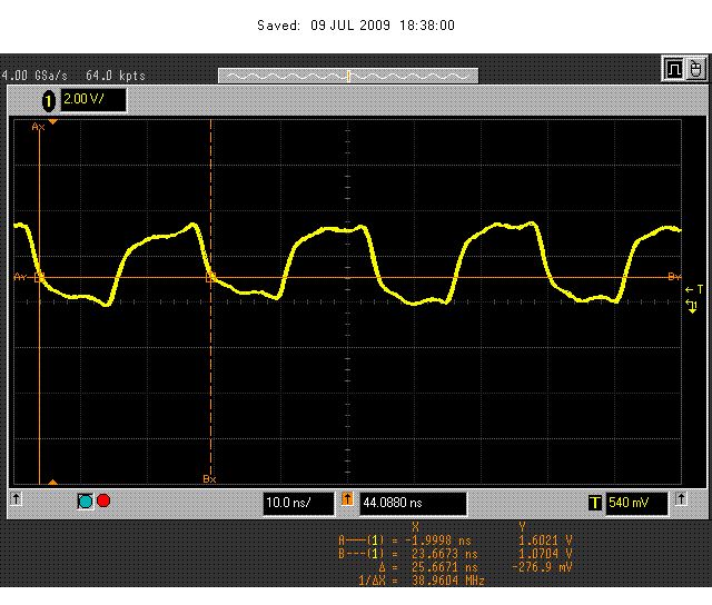 Hallo Kai, ich werde das gleich ausprobieren. Danke! Kannst du mir vielleicht auch erklären, warum der Clock vom uC so hässlich aussieht? Ich mein, es sind doch nur 40 MHz. Der Controller geht aber bis 72! und in dem Bild, das ich vorhin angehangen habe, ist der Clock _unbelastet_, nur mit ner 4 mm langen Leiterbahn.