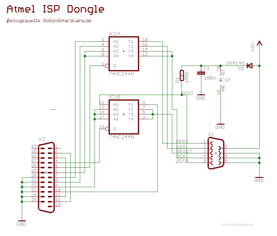 > Was bedeutet bei den Zahlen 10 und 20 dann noch VCC und GND?? Es sind die Nummern der Pins des 74HC244 ICs. > woher soll man die nehmen?? Aus der Schaltung in der der zu programmierende Chip sitzt. Aber: Der Parallelport hat bereits TTL-Ausgänge. Der 74HC244 ändert daran nichts mehr. Lass den 74HC244 einfach weg. Dann landest du bei den Programmierkabeln, die die anderen im Inetrnet so beschreiben. Da musst du dir auch keine Sorgen um die 5V machen. Wie viel Murks in der Schaltung sitzt, merkt man im Stecker. Der ist falsch. Man verwendet keinen Stecker einer seriellen Schnittstelle für einen ISP Anschluss.