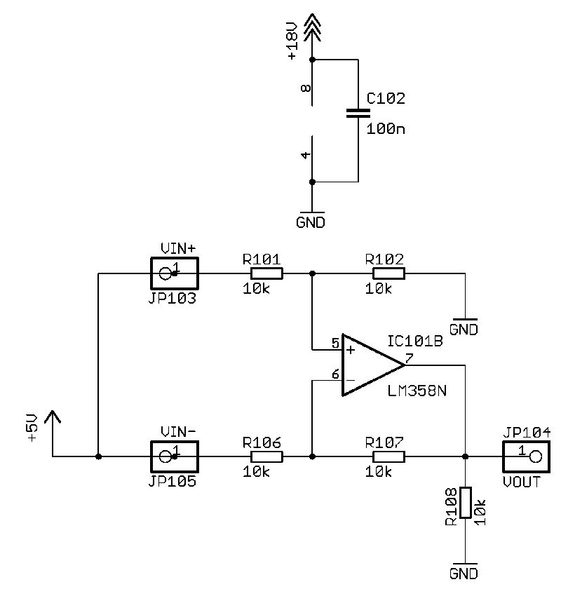 Bezieht sich Deine Eingangsspannung auf GND oder die +5V? Wenn auf +5V, mußt Du R102 auch auf +5V legen und die Ausgangsspannung gegen die +5V messen. Wenn gegen GND, dann mal allgemein je einen Widerstand zu den Eingangsspannungsquellen parallel schalten für definierte Verhältnisse. Empfehle trotzdem symmetrische Betriebsspannung.
