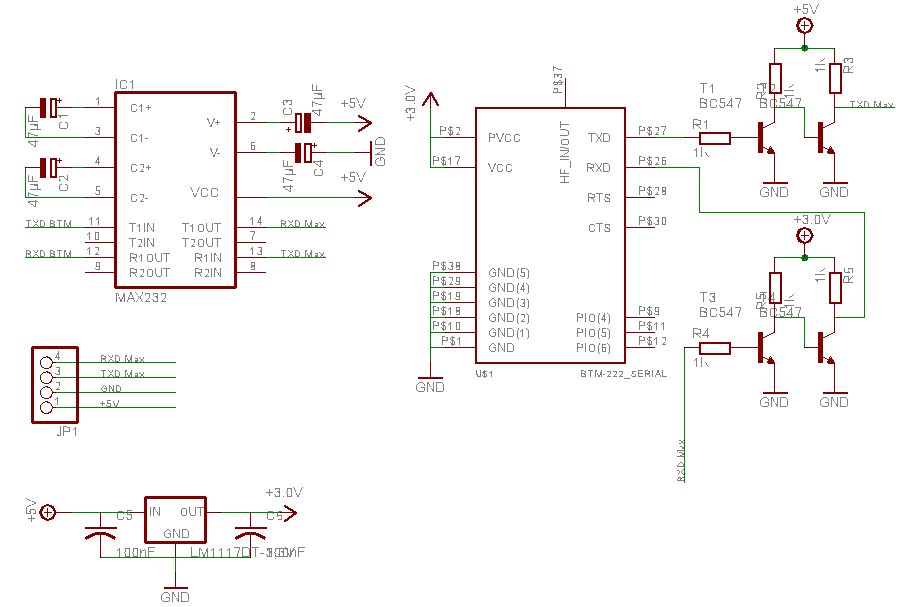 Da kannst du den MAX232 verwenden, er hat ja keine direkte Verbindung zum BTM. In deiner Schaltung hast du die Stromversorgung für den MAX vergessen, nur falls du sie fürs Layout verwenden willst.