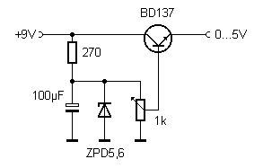 @Lothar Miller: Du liegst flashc! Das ist kein Steller, sondern ein Regler. Die Referenzspannung wird durch den Einstellregler in Verbindung mit der Z Diode vorgegeben und liegt an der Basis an. Am Ausgang (Emitter) liegt die Vergleichsspannung und diese Vergleichspannung wirkt sich auf den Basisstrom des Transistors aus. Der Transistor versucht mit seiner gesammten Stromverstärkung die Vergleichsspannung auf die Referenzspannung abzüglich der Flußsspannung der BE Strecke einzustellen. Das ist eine Regelung, wie mies auch immer. Gruß, Holm
