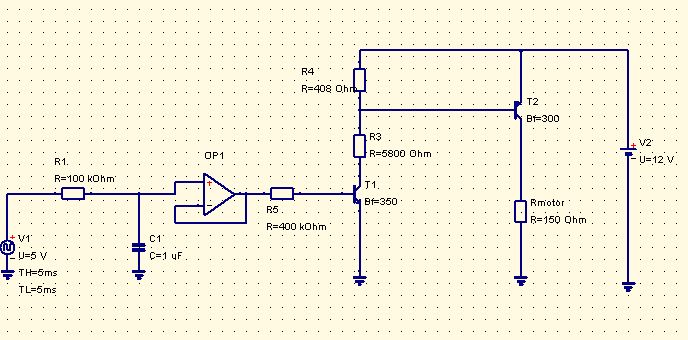 Hallo, hab mir deinen Vorschlag mal zu Herzen genommen. Da ich einen uC zur Ansteuerung nehme, ist die Invertierung der Schaltung oder die Nichtlinearitäten (in Grenzen) des Transistors kein Problem. Jetzt ist diese Schaltung noch nicht fertig bzw. optimal: 1. Blöde Frage, aber wie lege ich den Basiswiderstand aus, damit am Motor 6-12V ankommen? Eine Erklärung wie das ein Praktiker macht ist mir wichtiger, rechnen kann ich selber. Wie kompensiere ich (am Transistor?) das der OP in der Realität hinten nicht auf 12V hochkommt. 2. Den OP habe ich als Summierer ausgelegt, welcher die 5V (PVM) mit 1.2 verstärkt und dann auf 6V addiert. Somit 6V-12V als addierte Spannung. Dem +-Eingang verpasse ich 6V als Offset, somit sollten hinten 6-12V rauskommen. Leider sind es 7.2V-12V (laut Simulation). 3. ISt diese Schaltung so realisierbar? Ein LM324 als OP und evt. ein BD679A als Transistor? Danke + Gruß Bronko
