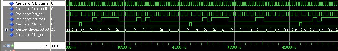 Daraus macht die Synthese erst mal: signal dacCounter : integer range 23 downto 0; Richtig. Willst du das? Ja. Sollte das nicht eher so heißen: signal dacData : unsigned(23 downto 0); signal dacCounter : integer range 0 to 2**(dacData'left+1)-1; Nein. dacCounter muß nur über die 24Bits der Ausgabe an den DAC zählen. Es werden kein 2 Hoch 24 Bits an den DAC ausgegeben. Irgendwie geht die Spannung ziemlich zackig auf 3,3V Vref, dann gibts Probleme. Zackig ist richtig. Sollte halt stufenweise auf die Maximalspannung gehen und dann wieder herunter. Halt eine Dreiecksspannung. Aber warum bleibt die Spannung eine ganze Weile auf dem Maximalwert ?