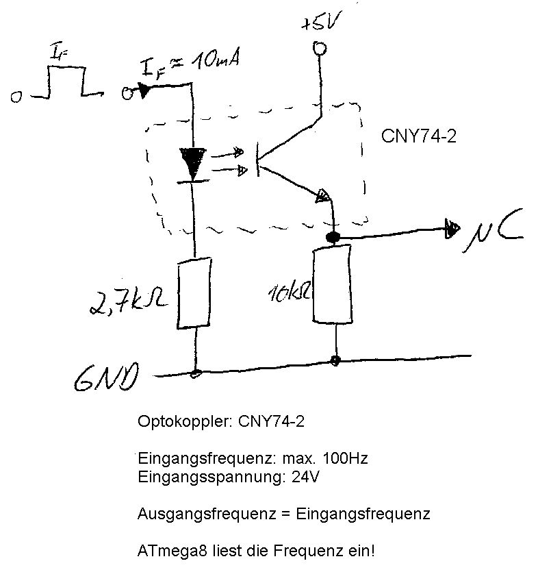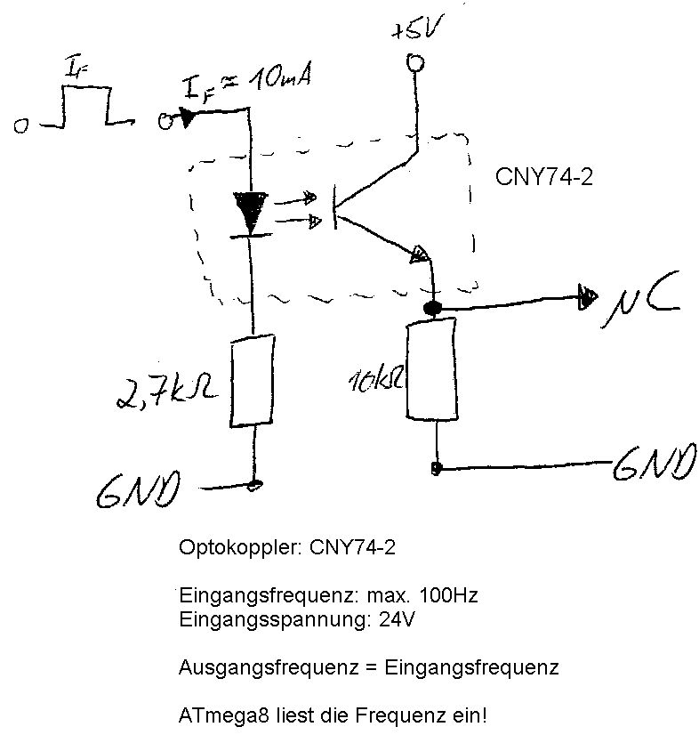 Hallo, ich benutze einen induktiven 24V-Sensor, der als Drehzahlsensor agiert. Wenn dieser Sensor durchschaltet, liegt eine Gleichspannung von 24V am Schaltausgang an. Mit einem ATmega möchte ich diesen Schaltzustand erfassen, aber 24V verträgt der Pin des µC's nicht. Kann ich, wie im angehängten Bild zu sehen ist, so den Eingang des µC's beschalten? Ich habe keine Erfahrung mit Optokopplern und bin mir etwas unsicher. Der Optokoppler hat ein CTR von 100, ist das wichtig für die Dimensionierung der Schaltung? Mit dem 2,7kOhm-Widerstand stelle ich doch den Strom auf der "Eingangsseite" ein, oder? Wie verhält der sich dann am Transistor? Habe den Widerstand 10kOhm nicht berechnet, sondern nehme an, dass dieser als Pull-Down dient? Gruß, Fritz