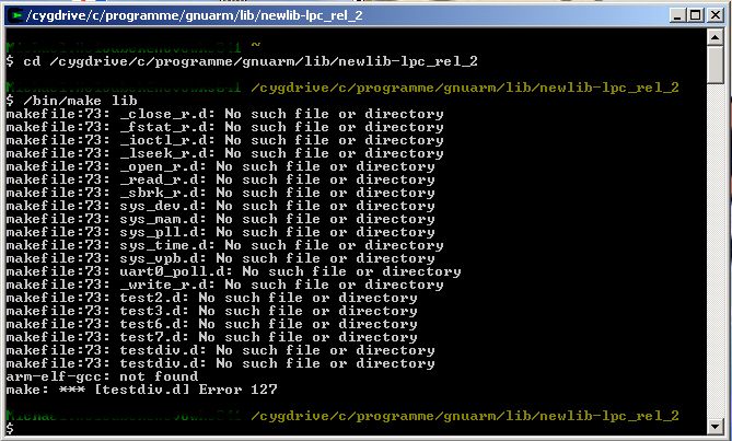 Hi! Hab gestern leider vergessen, die email rauszukramen. Ich schau nachher mal rein und Poste Dir die Vorgehensweise. Es sieht allerdings auf den ersten Blick nach falschen Pfaden aus! Du musst aber noch anderes beachten, da in der newlib schon "dummies" für malloc und fopen und so weiter eingebaut sind, die bei Verwendung der newlib-lpc stören! Wie gesagt, schreib ich alles später genauer...!
