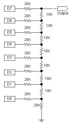 Hallo, einfach die 8 Ausgänge eines Ports damit verbinden und den gewünschten Wert ausgeben! Auflösung ist 8 Bit, aber die Widerstandskette kann natürlich auch verlängert oder verkürzt werden. MfG Andreas