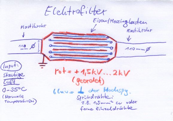 wir nutzen diesen Typ Filter zum entrussen von Abluft. Funktioniert ganz gut. Das System ist wie folgt aufgebaut(In Luftrichtung): Grobfilter aus Edelstahlwolle ungeladen. Vorstufe mit Draehten im recht grossen Abstand so etwa 3 cm. Diese setzen auch gerne eine dicke Schicht Schmodder an. Dann der Plattenfilter. Abstand der Platten ist etwa 7mm,Laenge x Breite etwa 300mm, Anzahl: Viele. Je eine Platte Spannung und Masse im Wechsel. Die Spannung ist einstellbar, wenn ein Lichtbogen fliegt ists zuviel. Das Geraet probiert beim Einschalten 2-3x die Spannung zu stabilisieren dann gehts auf Stoerung. Gelegentlicher Lichtbogen um Dreckkluempchen oder Feuchtigkeit wegzusprengen wird toleriert. Laestig ist die Reinigung alle 2 Monate.