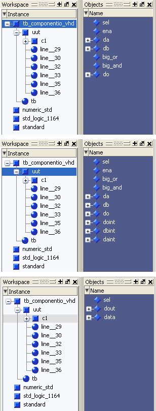 Dass ich das richtig verstehe: Bereits die zu simulierende Entity ist eine Komponente der Testbench. Und diese Entity kann wiederum Komponenten beinhalten. Und du willst die Signale dieser Einheiten mit in die Simulation aufnehmen? Dann ist der erste Schritt, die Singale im Objects-Fenster sichtbar zu machen, damit sie per Drag&Drop ins Wave übernommen werden können. Dazu wählst du im Workspace die Instanz/Komponente aus, deren Signale du sehen willst. Dann wie gesagt die gewünschten Signale per D&D ins Wave-Fenster. Danach (am einfachsten) in der Kommandozeile "restart" eintippen und danach z.B. "run 1000 ns". Im Screenshot siehst du exemplarisch eine Testbench mit einer UUT, die wiederum eine Komponente enthält.