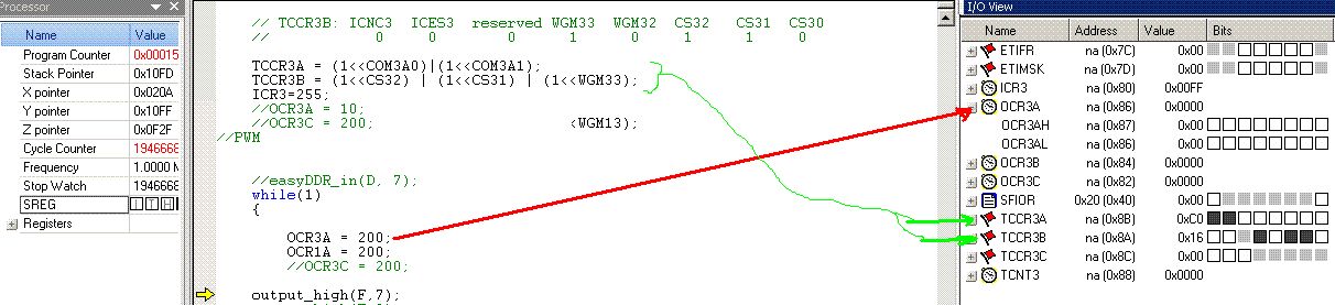 15 | OCR3A = 100; // Bei 100 sollte der Pegel an E7 auf "low" wechseln