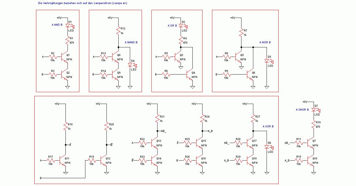 Ich sage du solltest den ein oder anderen Schaltungsteil noch einmal überdenken, z.B. bei deinem UND, die Last sollte immer im Kollektorzweig stecken, da sie im Emitterzweig eine Stromgegenkopplung darstellt und somit dem durchsteuern entgegenwirkt.