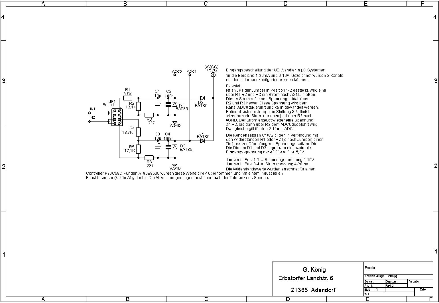 Hallo, der DS2450 tut mit der Schaltung, hab ich im Einsatz! Aber ich frag mich warum überhaupt so "krumme" Widerstandswerte genutzt wurden. Ich hab das grad mal mit R1=9k1, R2=8k2 und R3=240 (alles wenigstens mal aus der E24 Reihe) durch gerechnet und die Spannungen für 20mA->4,800V und 10V->4,812V sind weit unter 1% identisch. egal, trotzdem danke für die Schaltung! Achim