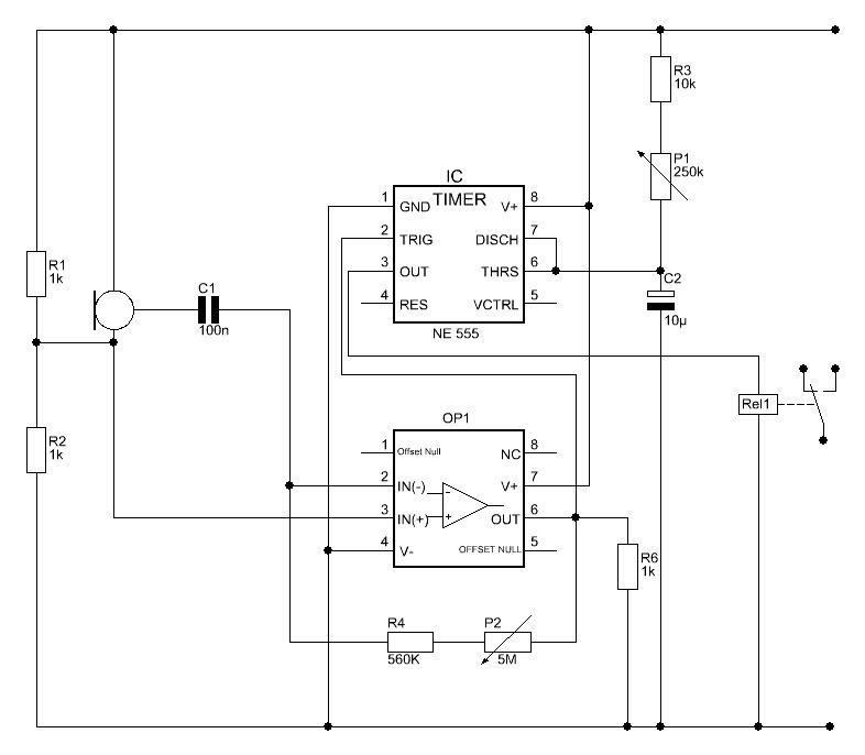 Zwischen C1 und Pin2 von OP1 muß wahrscheinlich noch ein Widerstand eingebaut werden, je nach Mikrofon. Was nimmst du für OP1? Dann brauchst du noch Entkopplungskondensatoren über der Versorgungsspannung und über R2 nach Masse. Die Versorgungsspannung für das Mikrofon solltest du vielleicht auch noch mit einem RC-Glied filtern, sonst kann die Schaltung instabil werden: Wenn der NE555 oder das Relais schaltet, gibt es einen kleinen Sprung in der Versorgungsspannung, diese wird über das Mikrofon wieder auf den Eingang von OP1 zurückgekoppelt, mitverstärkt und veranlaßt schließlich wieder den NE555 unkontrolliert durchzuschalten, usw. Kai