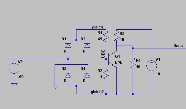 Hallo, ich soll über ein Projekt an der Uni eine Schaltung realisieren, die ab einer Schaltschwelle von Uschalt < |60|V (also der Betrag) am Ausgang ein "high" erzeugt. Ich habe dies durch einen Brücken-Gleichrichter und einer npn-Transistor-Schaltung realisiert. Es funktioniert auch eigentlich so, wie es soll. Nur liegen bei negativen Eingangsspannungen auch eine negative Ausgangsspannung vor (relativ zu ground). Hat jemand vielleicht eine Idee, wie ich diese negative Spannung wieder positiv bekomme? Ich hoffe die Problembeschreibung ist soweit verständlich. Vielen Dank schon mal für eure HIlfe