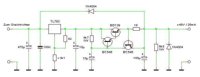 Hallo Greek, du könntest die Schaltung im Anhang ausprobieren. Sie zeigt einen TL783 mit zusätzlicher Beschaltung, um das Ausgangsrauschen drastisch zu reduzieren und eine Strombegrenzung zu erzielen. Der TL783 und der BD139 sollten sehr gut gekühlt werden. Dann sollte die Schaltung dauerkurzschlußfest sein. Die Elkos am Ausgang müssen bis mindestens 63V spannungsfest sein. Am Eingang auf jeden Fall 100V! Die Ausgangsspannung des TL783 sollte besser mit Festwiderständen eingestellt werden. Wird ein Trimmer verwendet, kann die Ausgangsspannung undefiniert ansteigen, wenn der Schleifer ein Kontaktproblem hat. Die Schaltung muß noch um einen Netztrafo und einen Brückengleichrichter ergänzt werden. Für den Netztrafo solltest du möglichst keine ganz kleine Ausführung wählen, da sonst der Leerlaufspannungsfaktor sehr groß werden kann und die Eingangsspannung beim TL783 ohne Nennlast viel zu hoch wird. Versuche mal einen 2x18V/10VA Trafo (Gerth 4800). Die Leerslaufspannung ist dann 23,4Veff pro Wicklung, also 66V maximal, wenn zwei Wicklungen in Serie geschaltet werden. Unter Last sinkt die Spannung jedoch etwas ab. Hier mußt du ein wenig experimentieren. Eventuell mußt du einen 2x24V/10VA Trafo nehmen. Achtung, der Brückengleichrichter muß die hohen Spannungen können! Vorsicht, die Spannungen, die am Siebelko entstehen, können durchaus gefährlich werden. Experimentiere mit der Schaltung nur, wenn du genau weißt, was du tust! Kai Klaas