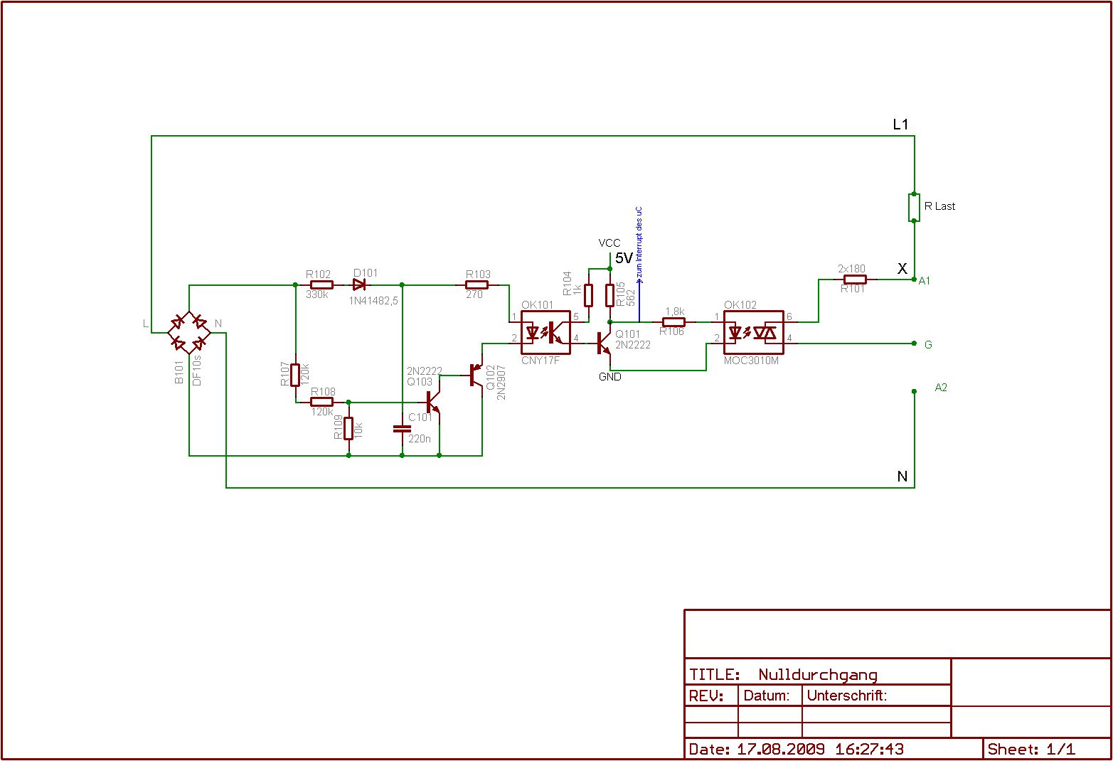 Hoi, hier meine Schaltung für die Nulldurchgangserkennung. Ein schnell aufgebautes Exemplar macht max 130uS Verzögerung (hinter dem MOC gemessen) Q102/103 in einem Gehäuse war die Idee, aber soetwas gibts wohl nicht. Gruß Anselm p.S.: C101 sind 22nF.