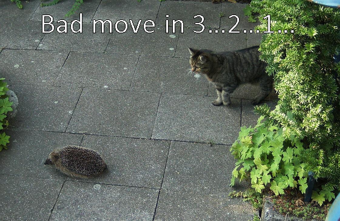 Dann kam ein Uhu und hat den Igel zerfetzt ;) Nix is passiert, langweiligerweise. Katze hat nen paar mal angepackt vorsichtig und ist dann unbeeindruckt wieder weggelaufen. Ja, bisschen schade ;)