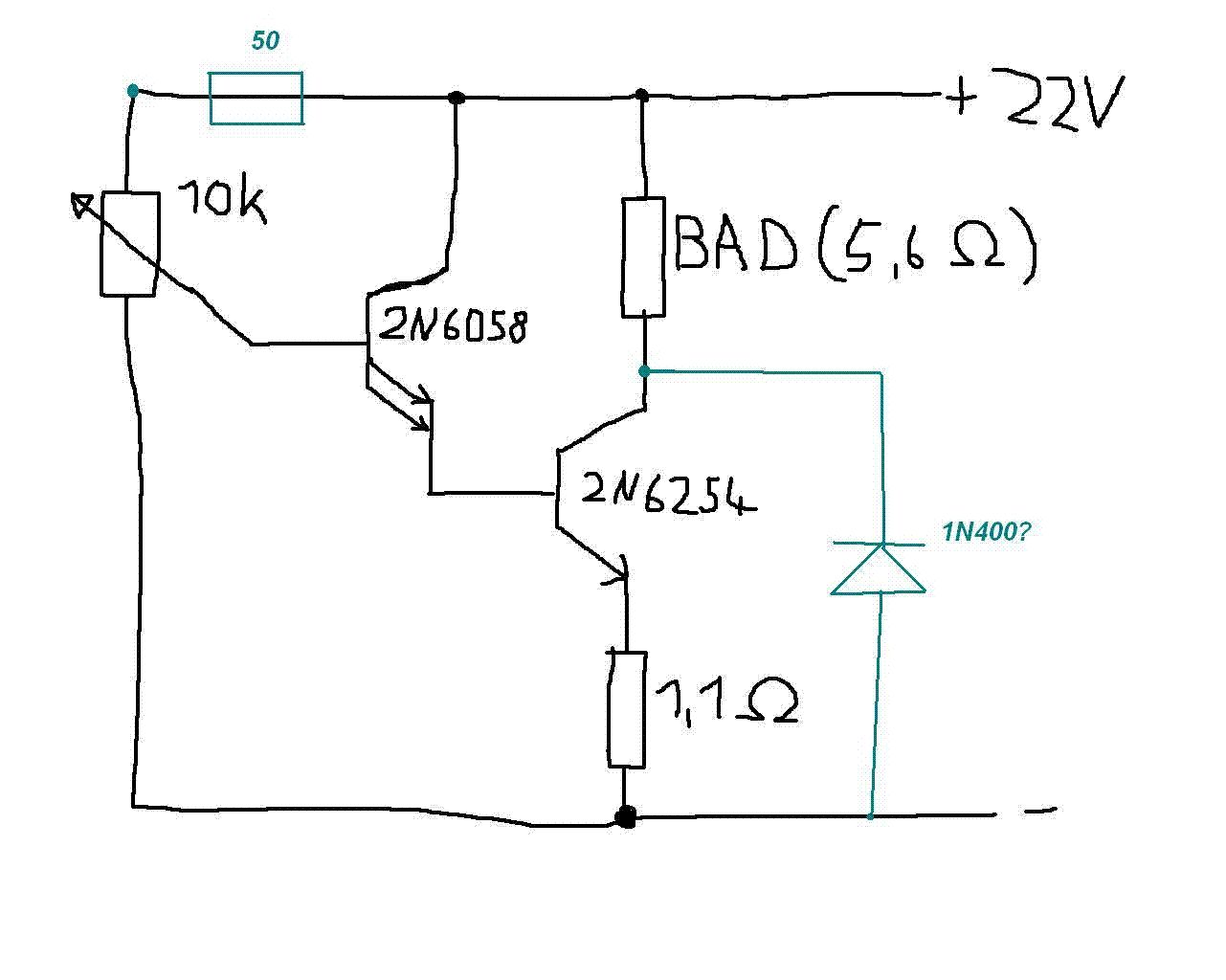 Wenn du eh schon den 2N6058 hast (Darlington, hfe typ 3500 @ 5A), dann kannst du dir den 6254 sparen. Der kann auch nicht mehr Leistung verbraten. Deine Schaltung ist sonst schon richtig - bis auf den 50-Ohm-R (siehe MaWin). >Und wo bekomme ich eine Konstante Spannung her? Sind deine 22V nicht ausreichend konstant? Sonst baue einfach eine Z-Diode (z.B. 5.6V) oder zwei LEDs in Serie nach dem 10k-Vorwiderstand parallel zum Poti ein.